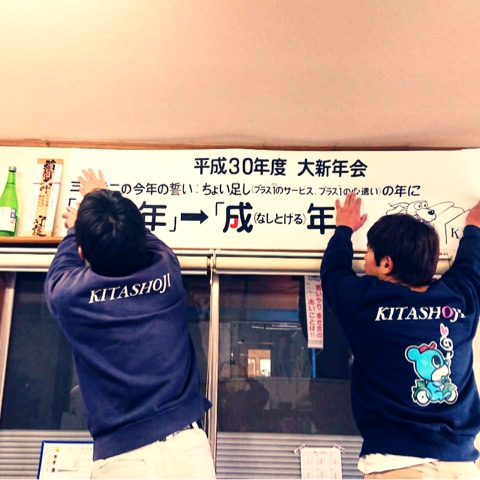 そして、新年会恒例のカサハラレタリングさん作「今年の誓い」を早速ルーキー怪物くんたちが貼ってくれました!